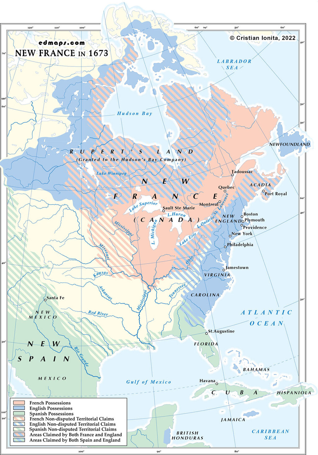 By 1673, New France had significantly expanded its territorial claims and administrative structure, though effective control remained concentrated in specific river valleys while vast claimed territories remained sparsely governed.